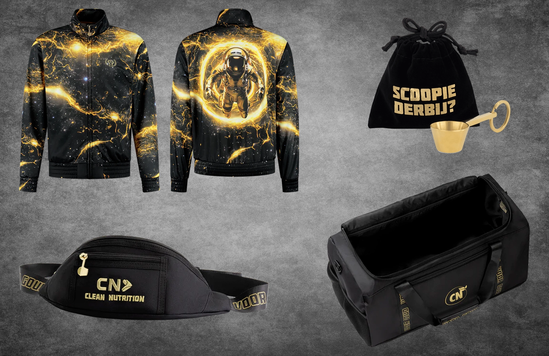 Voor CN Supplements, het merk van fitnessicoon Joël Beukers, ontwierp ik meerdere collecties waarin de herkenbare gouden uitstraling en energieke persoonlijkheid van het merk zijn vertaald naar opvallende en functionele ontwerpen voor de fitnesscommunity.